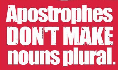 4. Apostrophes don’t make nouns plural. Get this through your head, even if you have to chant it like a mantra.